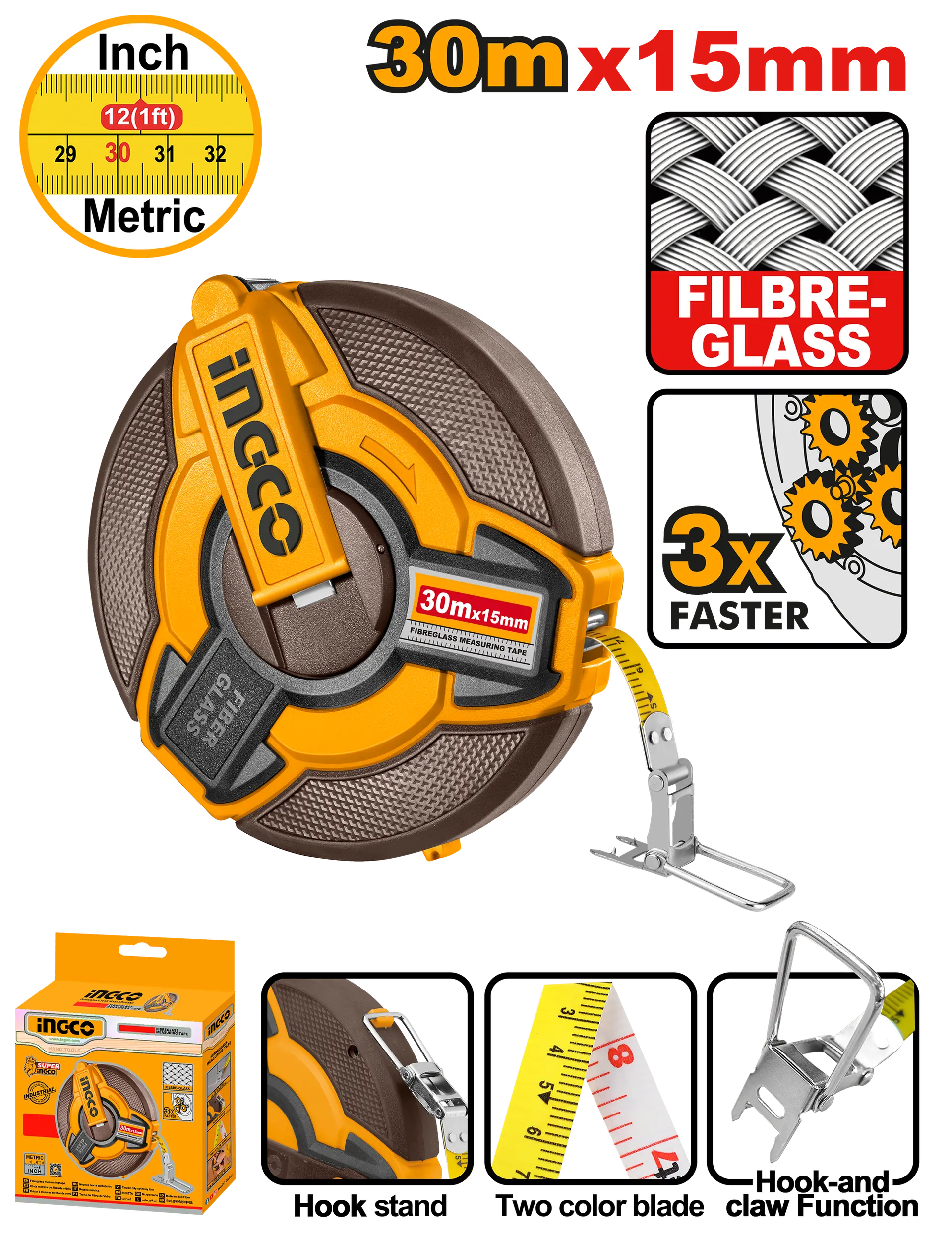 Ruleta cu banda de fibra 30 m INGCO – profesionala si rezistenta