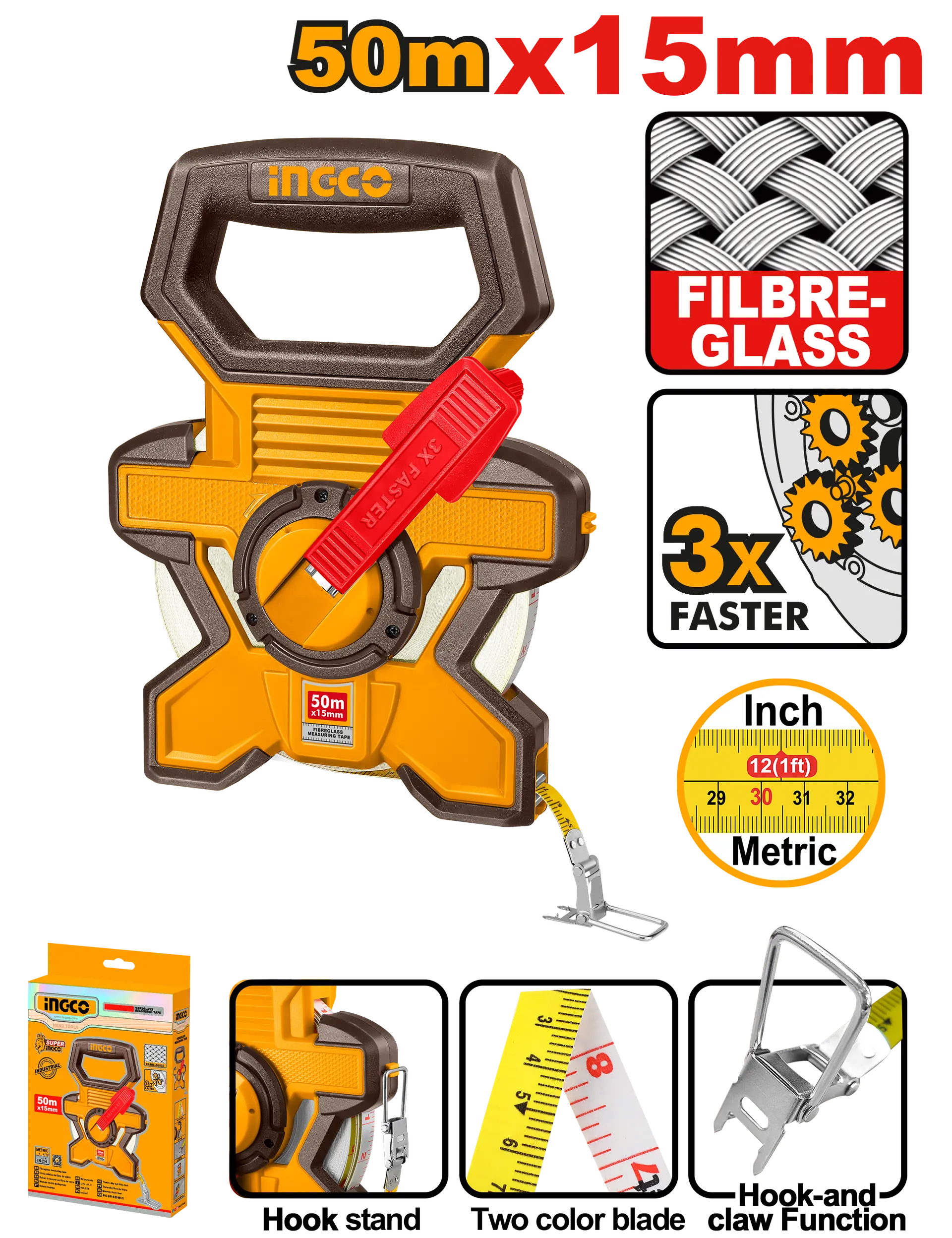Ruletă INGCO 50 m, cu bandă din fibră de sticlă rezistentă și manivelă de retragere rapidă.