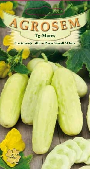 Semințe de castraveți albi, soiul Paris Small White , ambalaj 1.5g Agrosem . Produce fructe de culoare albă, cu coajă fină și pulpă foarte crocantă. Soi exotic, ideal pentru salate inedite și murături spectaculoase.
