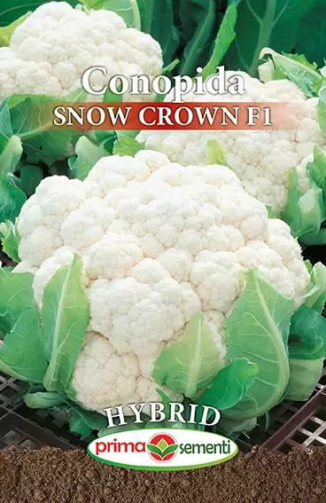 Semințe de conopidă Snow Crown F1 Hybrid, ambalaj 0,4g Prima Sementi. Hibrid foarte timpuriu, rezistent la stres și temperaturi scăzute. Produce căpățâni albe, dense și delicioase. Ideal pentru culturi timpurii de primăvară și vară.