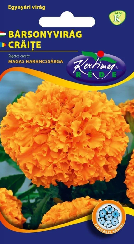Crăițe înalte portocalii (Tagetes erecta), ambalaj 1g Kertimag. Flori anuale viguroase cu inflorescențe mari, globuloase. Rezistente la soare, excelente pentru fundalul grădinii, flori tăiate și combaterea naturală a dăunătorilor.