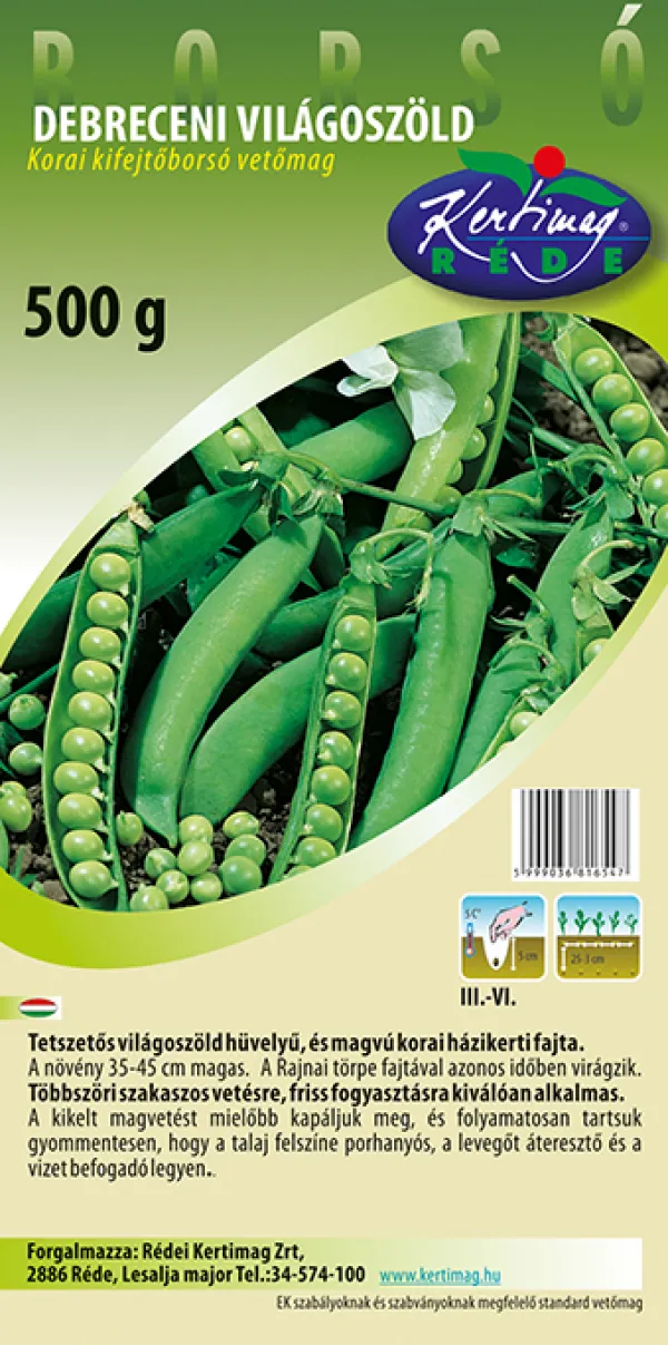 Mazăre de grădină Debreceni Vilagoszold, ambalaj 500g Kertimag. Soi semitimpuriu cu bob neted, rezistent și foarte productiv. Păstăi lungi cu boabe mari, ideale pentru consum proaspăt și conservare. Calitate superioară pentru suprafețe mari.