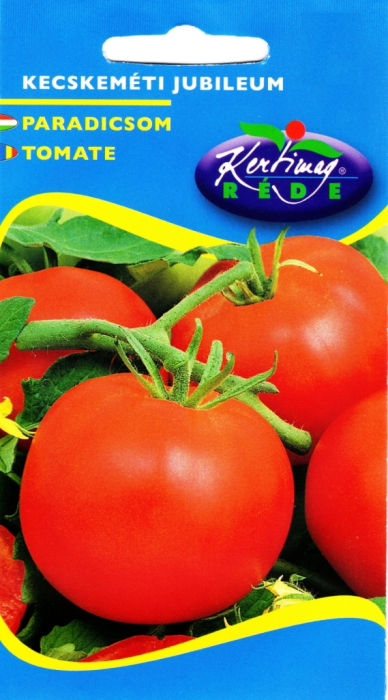 Seminte de tomate, soiul Kecskemeti Jubileum, ambalaj 0.5g Kertimag. Soi determinat (tip tufa), productiv si rezistent. Fructe mari, rosii, carnoase, ideale atat pentru consum proaspat, cat si pentru sucuri sau bulion.